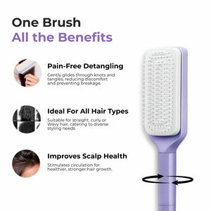 This smart hair brush features an easy twist self-cleaning mechanism that instantly removes trapped hair from the bristles. Just rotate the handle and remove hair in seconds—quick, hygienic, and effortless.